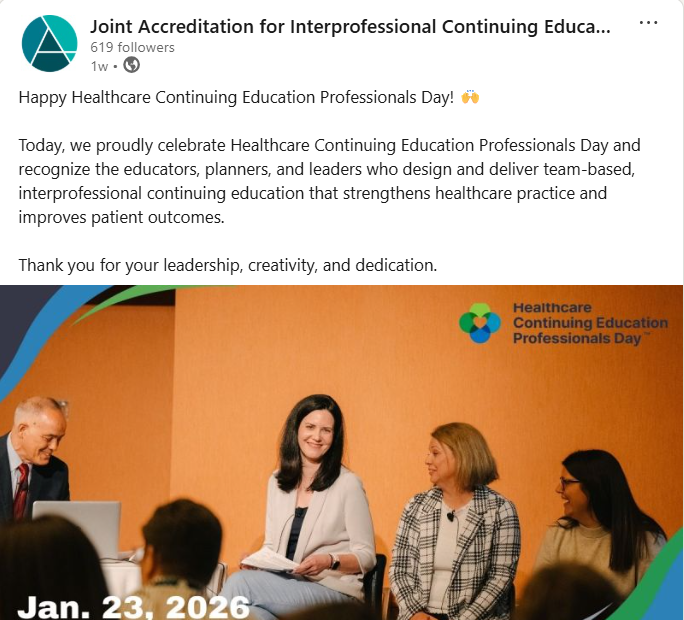 Thank you for helping make Healthcare Continuing Education Professionals Day a success! Accredited providers across Joint Accreditation and the Accreditation Council for Continuing Medical Education (ACCME) highlighted the vital work of their teams through social media (#CEProfessionalsDay), internal celebrations, newsletters, and messages from senior leadership, driving more than 6,400 impressions, nearly 600 engagements, and 268 clicks with a potential reach of 335,800+ on social media! Mark your calendar now for next year’s celebration–January 22, 2027.